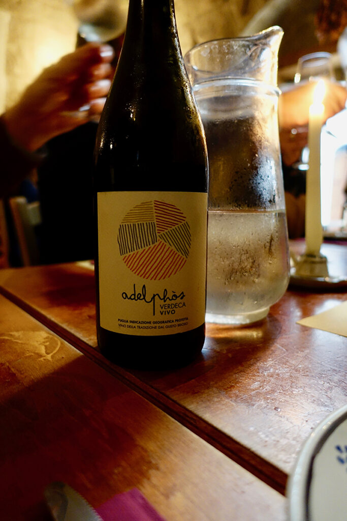 Adelphos Verdeca Vivo Puglia Igp, di Angiuli Donato, un vino dai riflessi dorati, sentori di fiori bianchi e di vaniglia, trama sapida persistente e una leggera briosità. Ottimo per accompagnare un piccolo aperitivo prima del nostro pranzo.